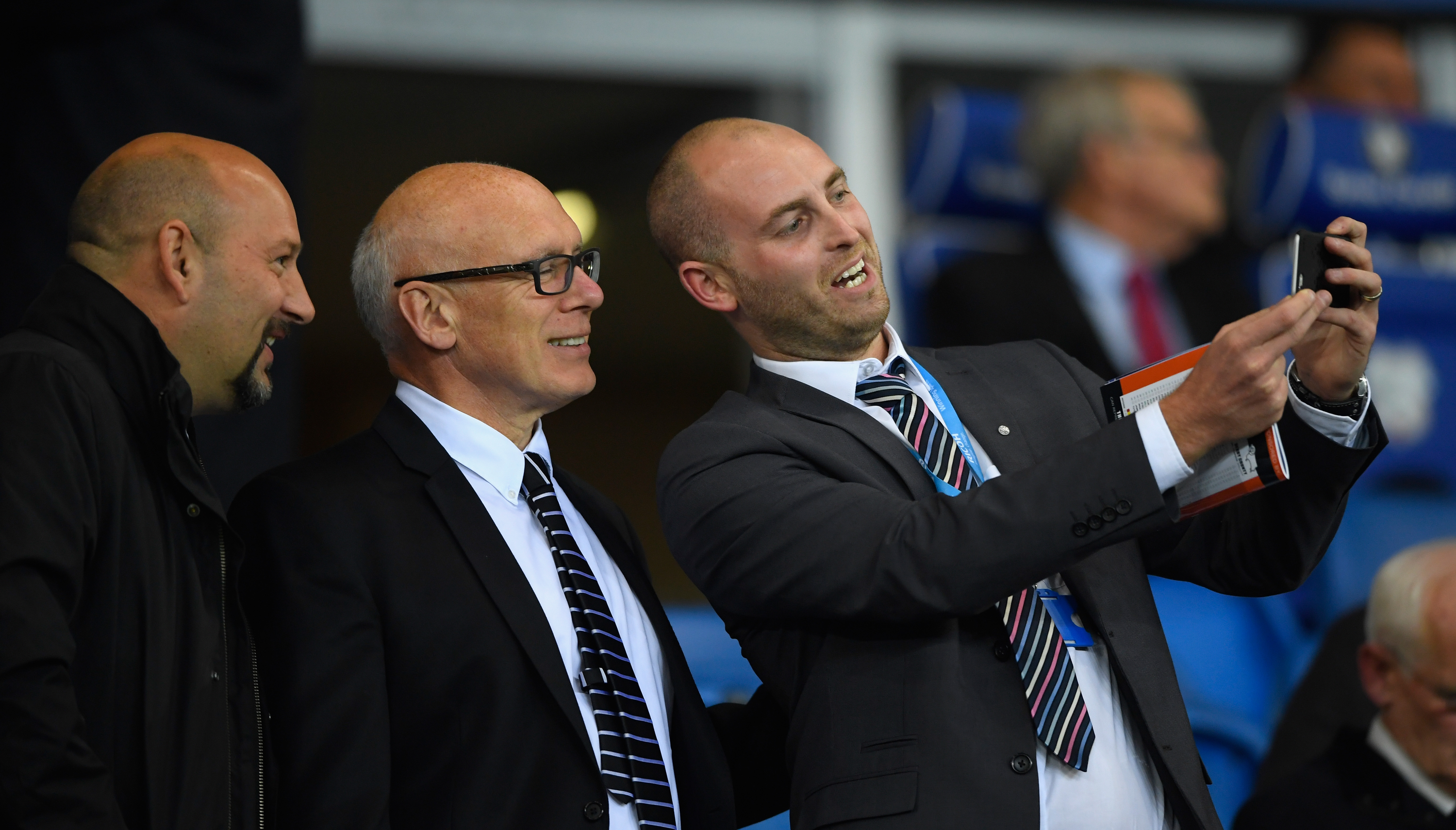 Getty Images | Derby president Sam Rush (l) and chairman Mel Morris (c) pose for a selfie with a fan before a match.
