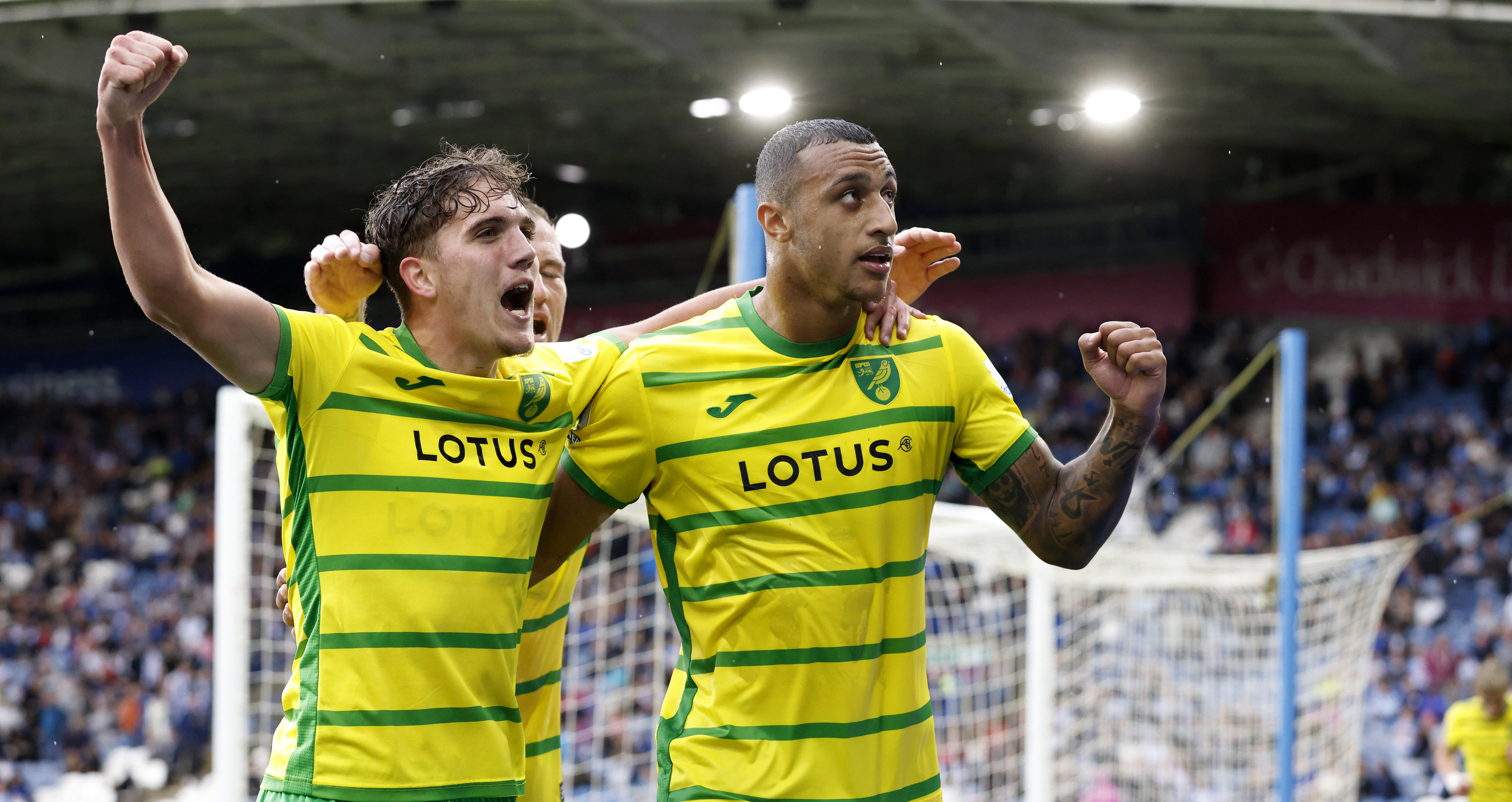 IMAGO | Norwich City FC's Adam Idah (R) celebrates scoring a goal against Huddersfield Town.