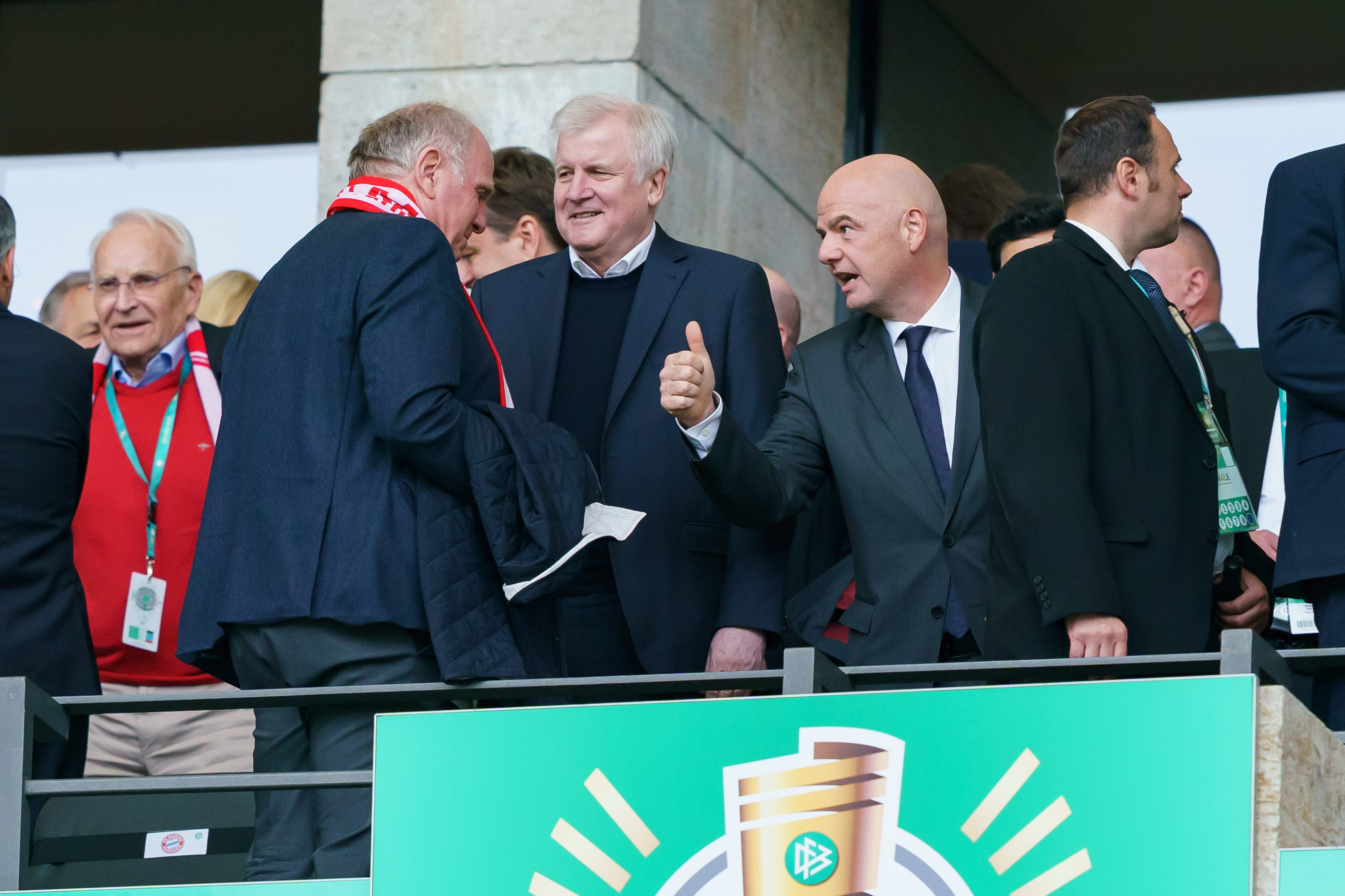Getty Images | The FIFA meeting on Wednesday will confirm the unopposed re-election of FIFA president Gianni Infantino after 40 comparatively smooth months in charge. Pictured is Infantino doing a "thumbs up" to Bayern Munich president Uli Hoeness prior to the DFB Cup final between RB Leipzig and Bayern Muenchen at Olympiastadion on May 25, 2019 in Berlin, Germany.