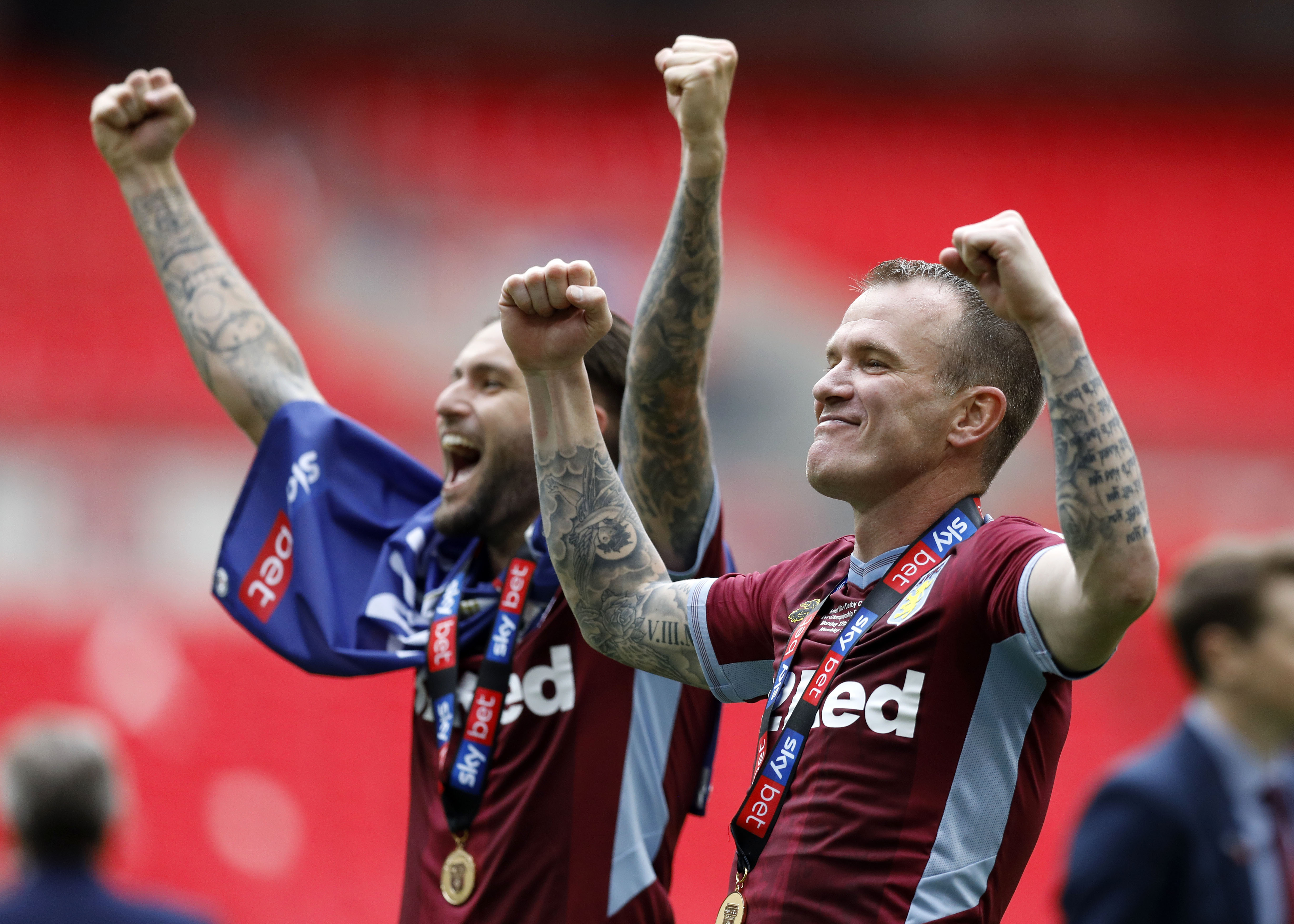Getty Images | Henri Lansbury (l) and Glenn Whelan of Aston Villa celebrate following the clubs promotion after beating Derby in the play-off final Monday.